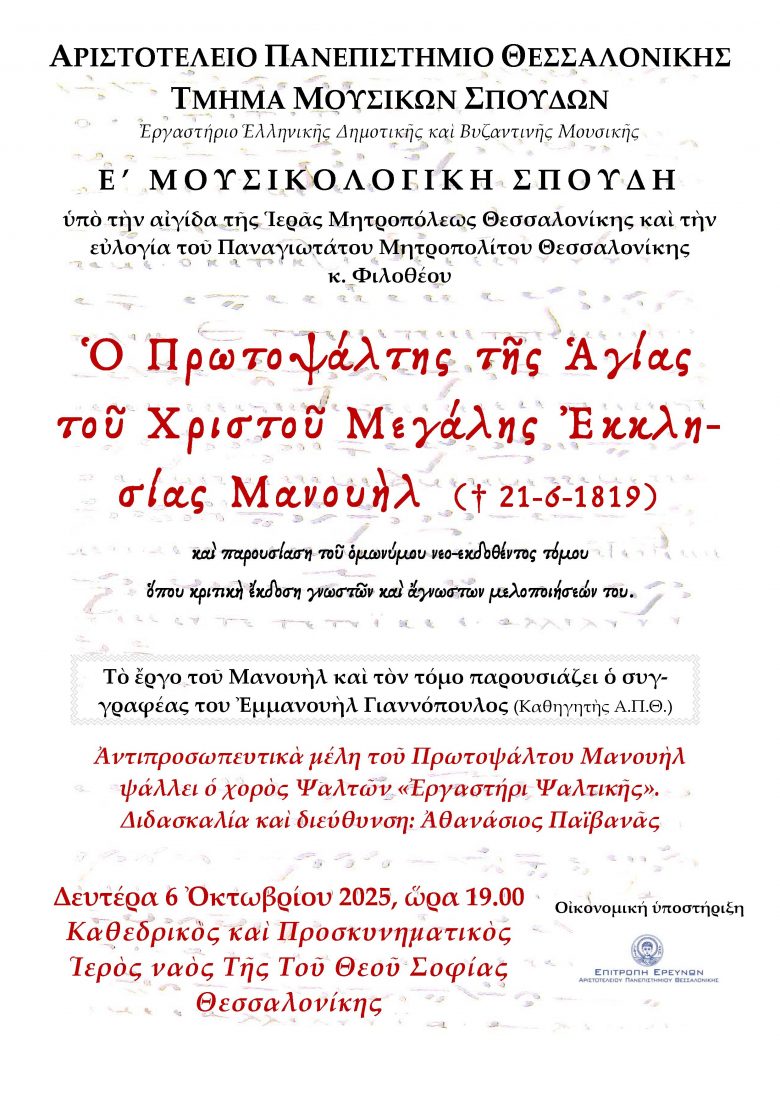 Στις 6 Οκτωβριου 2025 και ώρα 19:00, στον Ιερό Ναό της του Θεού Σοφίας στην Θεσσαλονίκη, θα λάβει χώρα η Ε΄ Μουσικογική Σπουδή με τίτλο «Ο Πρωτοψάλτης της Αγίας του Χριστού Μεγάλης Εκκλησίας, Μανουήλ» (+21-6-1819). Τον ομώνυμο νεο-εκδοθέντα τόμο και το έργο του Μανουήλ Πρωτοψάλτου θα παρουσιάσει ο Καθηγητής του Α. Π. Θ. κ. Εμμανουήλ […]